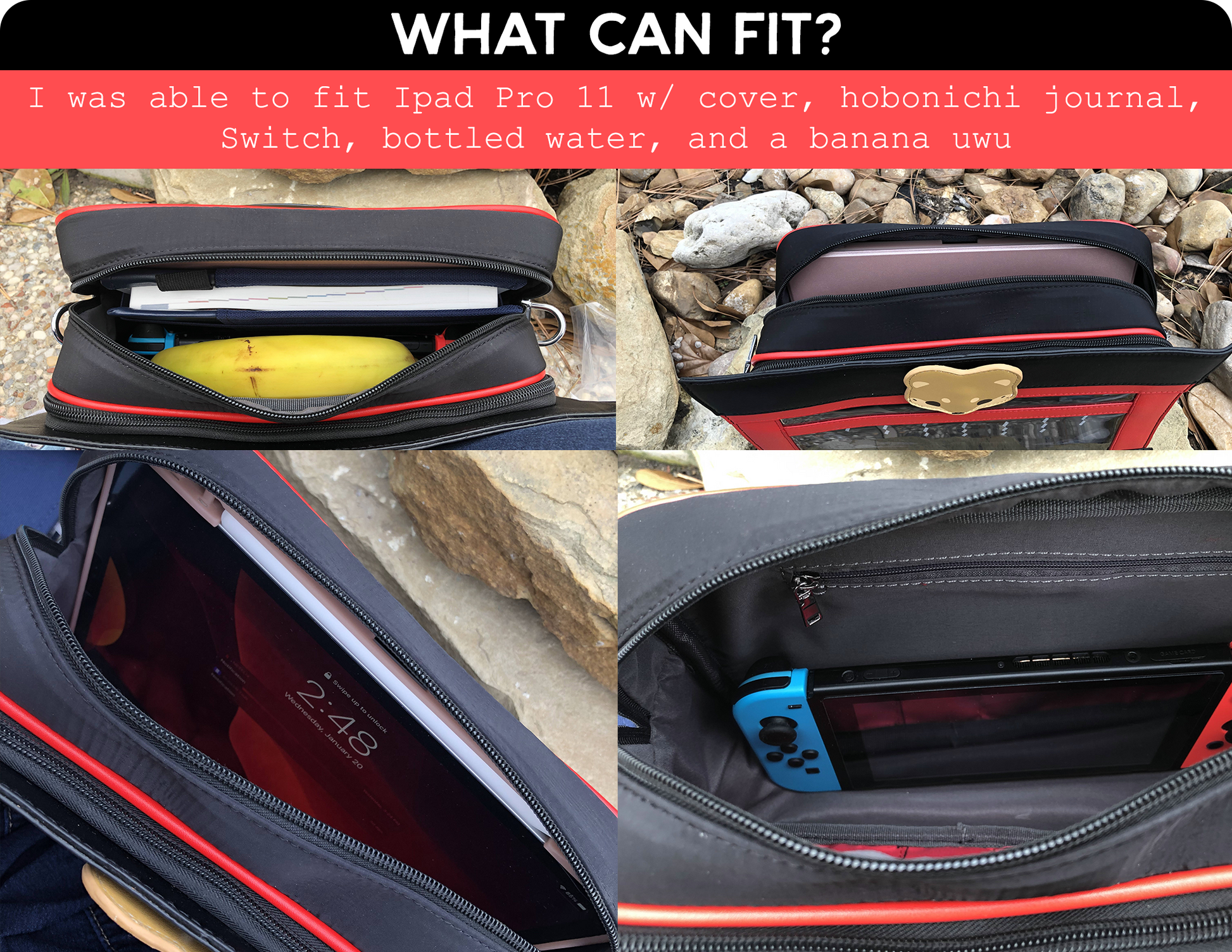 Bag is big enough to fit an iPad Pro 11in with bunch of other things.