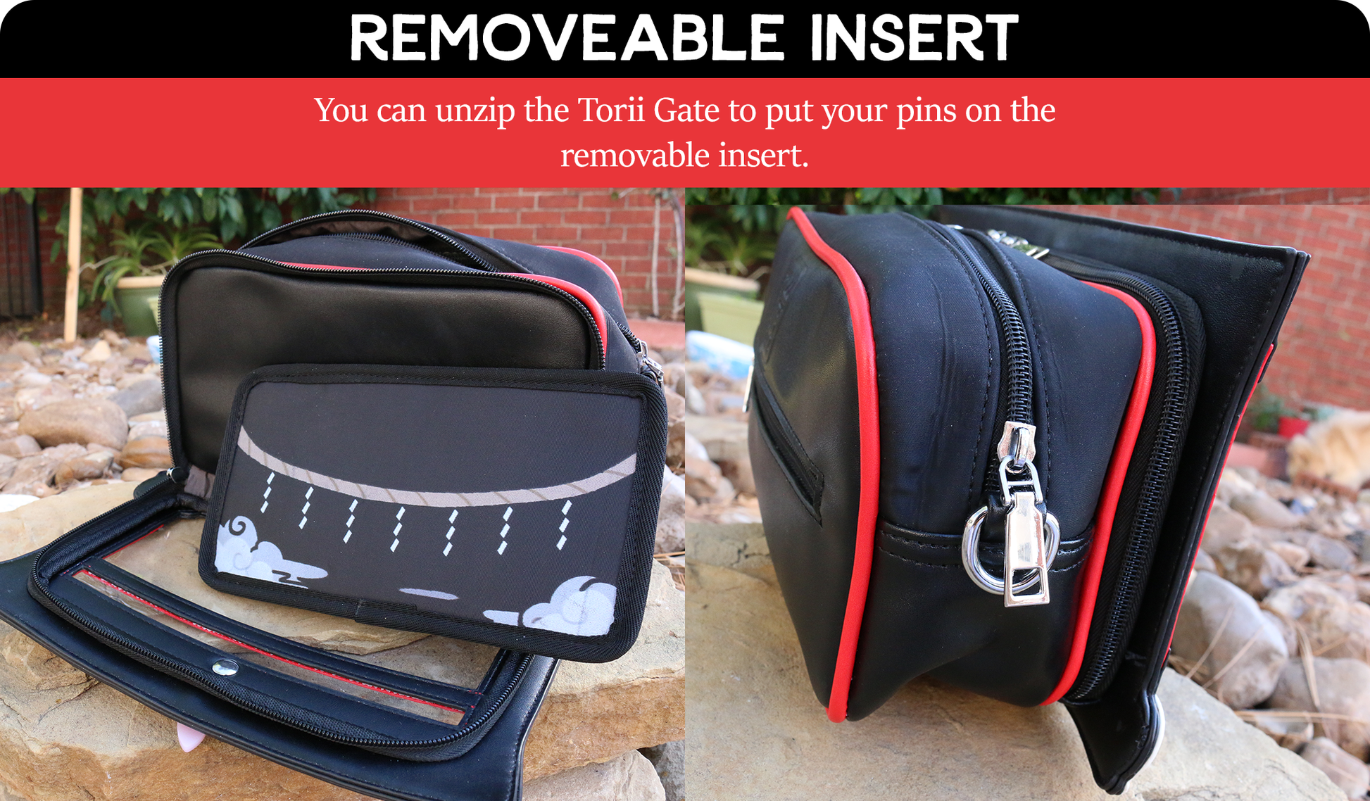 The bag is about 12in x 8in and made if faux leather and nylon. With the torii gate shape it may be ~1in wider/taller.